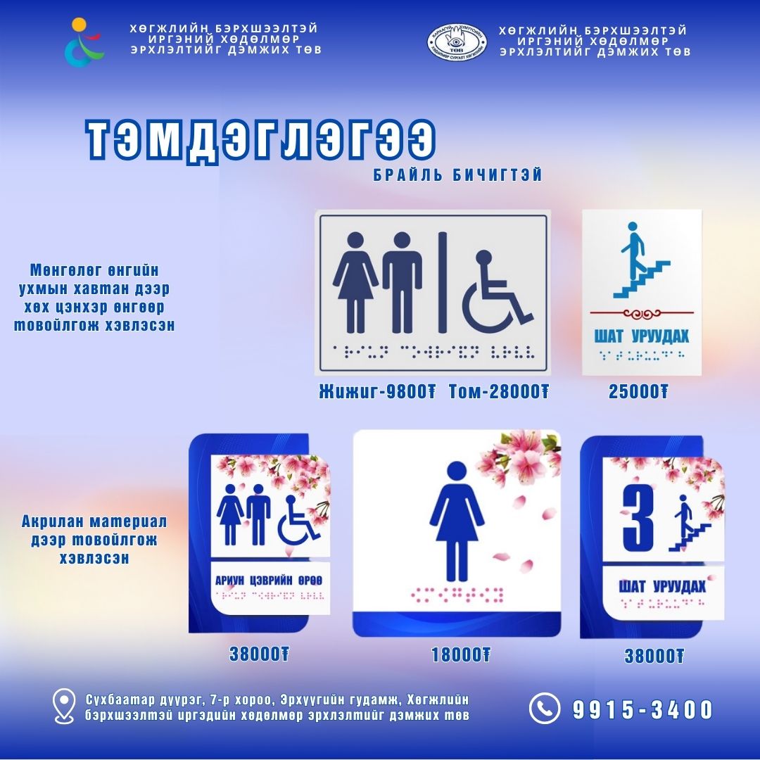 Хэрэв цаашдаа танай байгууллагад зориулсан Брайль хэвлэл, тусгай тэмдэглэгээ, хүртээмжтэй орчны бусад шийдэл хэрэгтэй бол бидэнд хандаарай. Бид туслахдаа үргэлж баяртай байх болно!